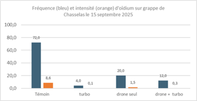 Die Auswertungen zeigten, dass die Methode "Drohne mit ergänzenden Bodenbehandlungen im Bereich der Trauben" wirksamer war, um den Mehltau in diesem Bereich einzudämmen, als die Drohne allein. Die Wirksamkeit der Drohnenbehandlungen nimmt bei höherem Krankheitsdruck ab. Bei stärkerem Befall kann der Schutz durch Drohnen vollständig versagen, was zu erheblichen Ernteausfällen führt. Ein Versuch mit Chardonnay in Dardagny im Jahr 2023 konnte keine ausreichende Wirksamkeit des Schutzes durch Drohnen allein oder in Kombination mit zwei Bodenbehandlungen nachweisen.
