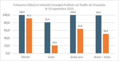 Ein Versuch in Lavaux an Chasselas im Jahr 2023 lieferte hingegen vielversprechendere Ergebnisse: Die Behandlungen, die allein per Drohne sowie per Drohne in Kombination mit zwei Bodenbehandlungen durchgeführt wurden, zeigten einen Schutz gegen Mehltau, der fast dem der durchgeführten Behandlungen entsprach. Dies legt auch nahe, dass der Besitz einer eigenen Drohne einen Einsatz mit optimalerer Positionierung und einer besseren Schutzwirksamkeit ermöglichen würde, als wenn sie als Dienstleistung ohne optimale Positionierung eingesetzt wird