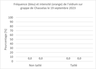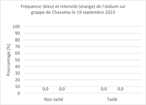 Insgesamt schien die Echter Mehltau-Häufigkeit an den Blättern bei den unbeschnittenen Chasselas-Parzellen etwas höher zu sein als bei den beschnittenen. Dieser Unterschied war überraschenderweise auf der Parzelle mit der resistenten Sorte Divico stärker ausgeprägt, wo der Echter Mehltau-Befall an den Trauben im unbeschnittenen Teil höher war. - Jahre mit sehr starkem/extremem Befallsdruck (2024):