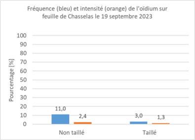 In einem Jahr, das durch einen geringen Befall mit Mehltau und einen mäßigen Befall mit Echten Mehltau gekennzeichnet war, erwies sich der Schutz vor Blatt- und Traubenmehltau bei der "beschnittenen" Variante als etwas besser als bei der "unbeschnittenen" Variante.